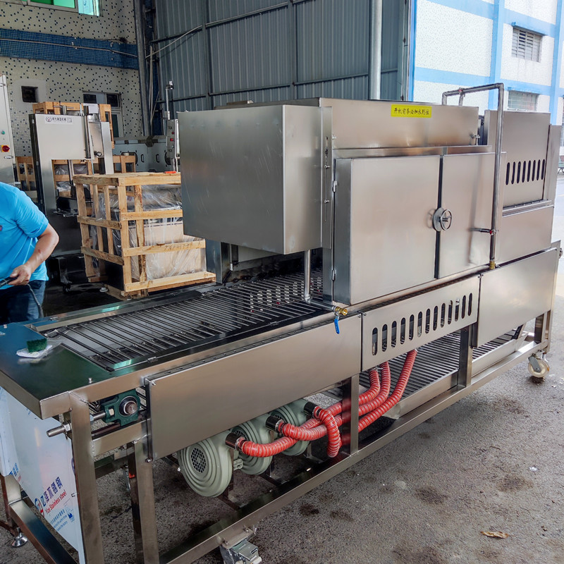 2024年8月23日、坐標廣州九盈(yíng)機械公司和www.91视频.com食品機械公司綜合廠區(qū);新型大豬腳燒毛機整裝待發;該設備主要用於豬腳、肘(zhǒu)子、清除肉皮表層的長毛、具有高(gāo)效安全、操作簡單的特點、特別是根據客戶生產物料的大小可以進行、輸送變速、火苗大小(xiǎo)調整、本機具有(yǒu)天然氣和液化氣雙用的功能;采用上層5頭噴火、下層6頭噴火;共計11個噴火頭360度全覆蓋燃(rán)燒;
