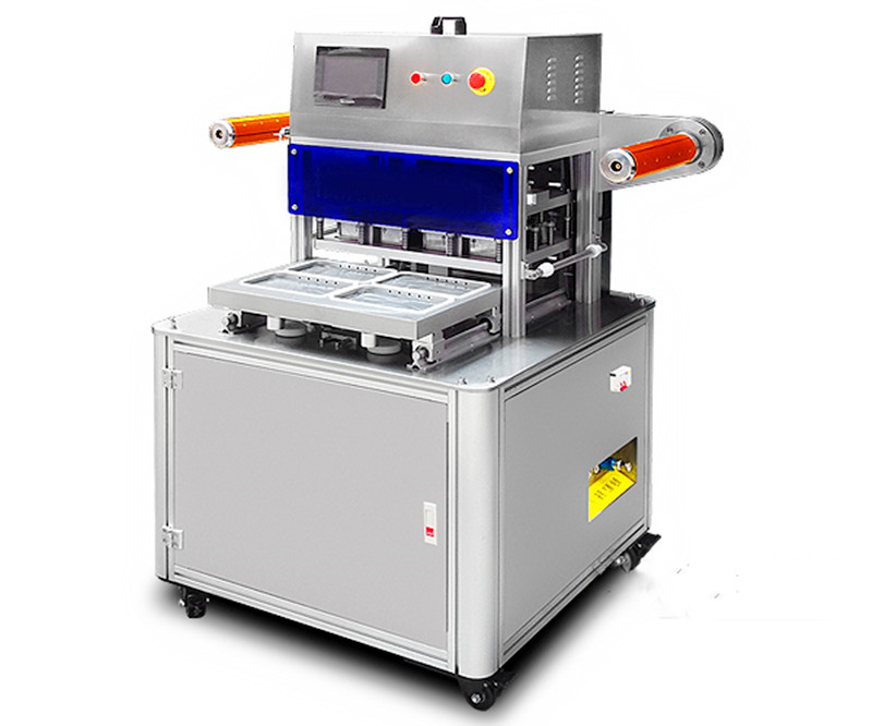 放盒(hé)→按開關→下模進入(到位)→上模向下(xià)與下模合模(到位)→去除自然空氣→充入(rù)混合保(bǎo)鮮氣體(N2、O2、CO2 等)(完畢)→密封封口、切膜→放氣→上(shàng)下模(mó)具分開→下(xià)模退出、包裝成(chéng)品頂出→拿出成品。
