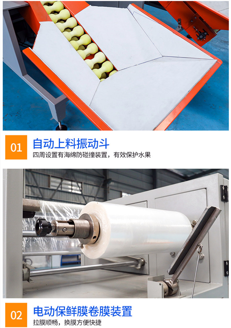 全自動(dòng)水果保鮮膜包裝機;適用於單果包裝,包裝速度快,並且能有效(xiào)保護水果不受損傷,省人工,提升效率;操作簡便,更(gèng)換拉膜裝置簡單,智能溫控切刀,有效防止漏包,高(gāo)感度光電(diàn)眼色標跟蹤,使封切位置更加準確(què);運行轉動係統簡潔,工作更可靠,維護保養更方便。